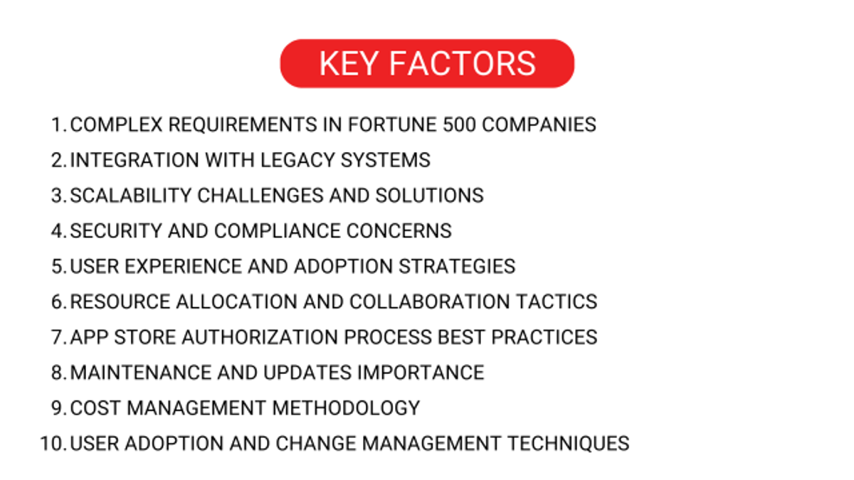 Choosing the right app development framework for a Fortune 500 company is crucial to ensure the success of your application. There are several key factors that must be considered, such as complex requirements, integration with legacy systems, scalability challenges and solutions, security and compliance concerns, user experience, resource allocation and collaboration tactics, app store acceptance process best practices, maintenance and updates importance, cost management approach, user adoption and change management techniques. With so many frameworks available in 2023, it can be overwhelming to choose the right one. However, each framework has its own functionality and advantages like React Native’s cross-platform capabilities or Flutter SDK’s Google integration. Choosing the right app development framework is important because it affects the performance of the application and its ability to meet business requirements. To learn more about how to choose the right app development framework for your company, check out our comprehensive guide on app development frameworks for Fortune 500 companies