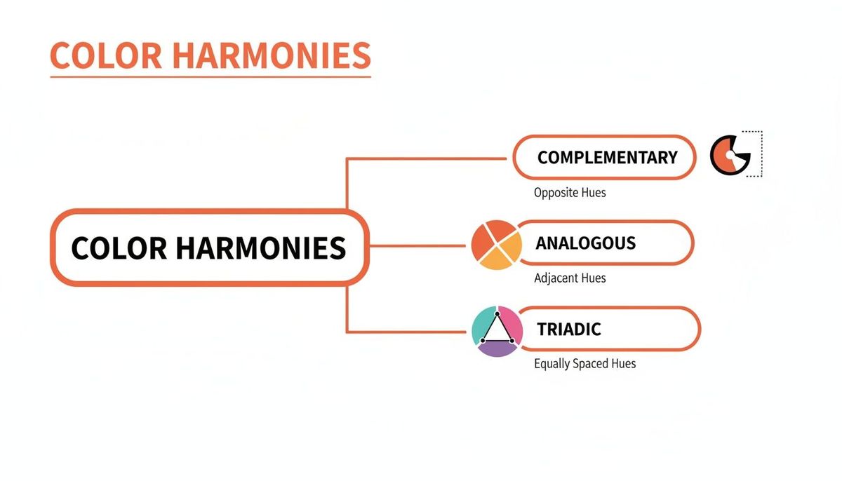 Understanding these psychological triggers becomes even more effective when you pair them with color harmonies. The visual below breaks down the core relationships—complementary, analogous, and triadic—that form the structural backbone of any good color palette.
